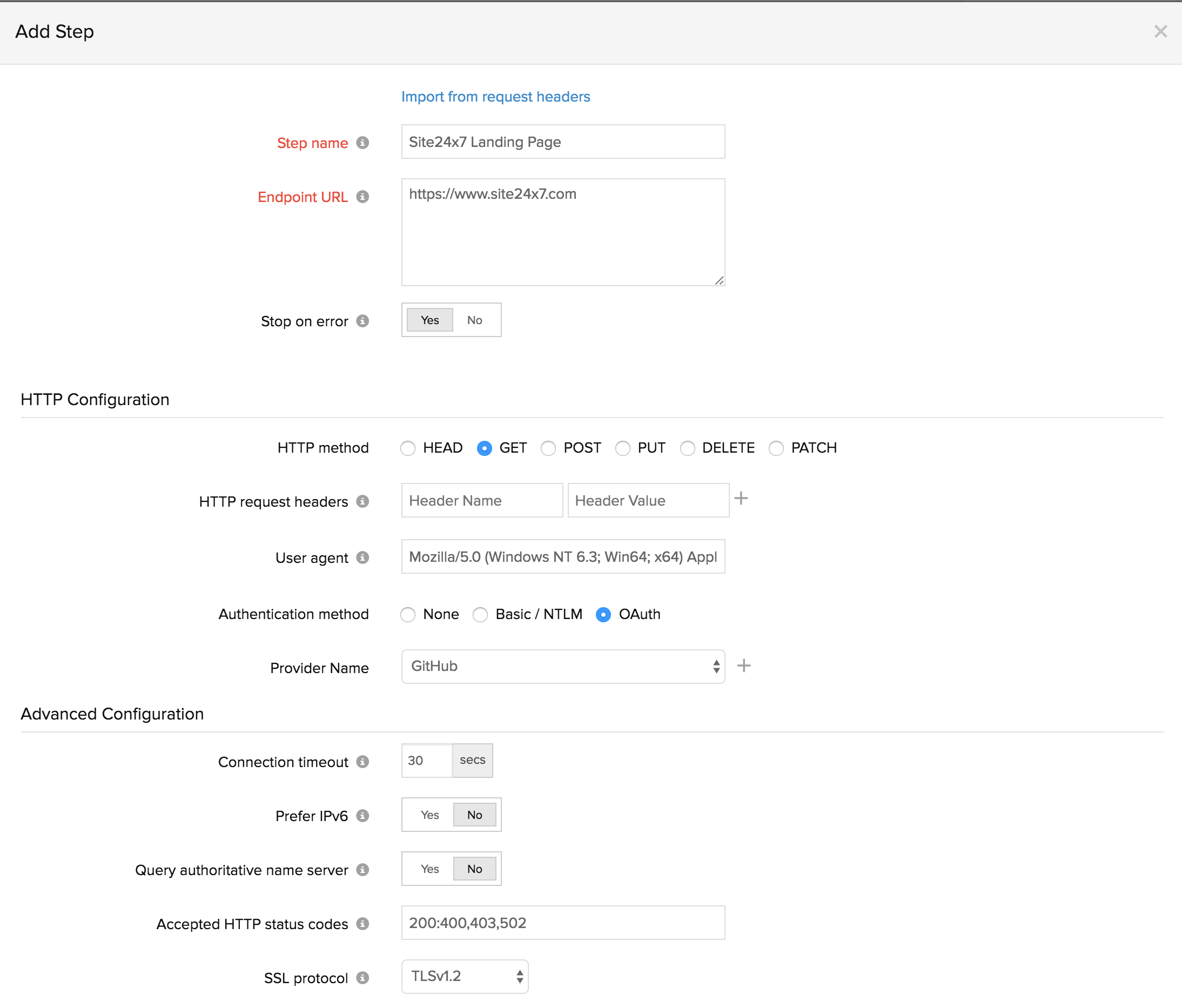 With Site24x7 you're able to measure multiple aspects of your HTTP CRUD operations in JSON, Text, XML, and Form based input. You can perform corresponding HTTP operations of GET, PUT, POST, DELETE, HEAD, and PATCH to test actual CRUD sequences in production. Additionally, APIs secured using Basic/NTLM, Client Certificates or OAuth can also be monitored.