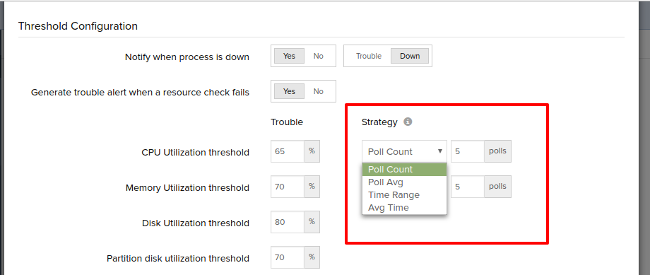 Poll count : When the set threshold value is breached continuously for the "Poll count", monitor status changes to trouble.