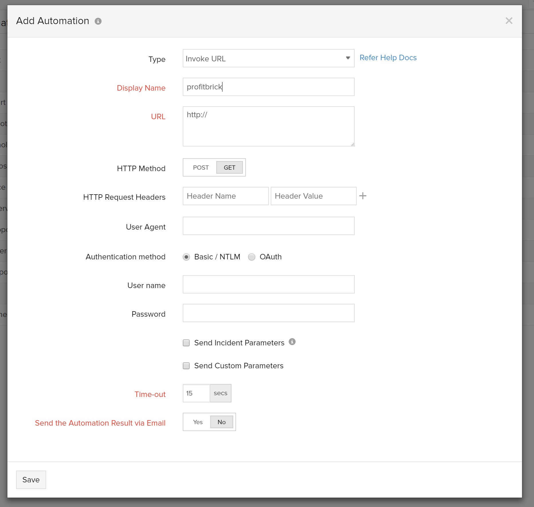 2. Select the Automation Type as Invoke URL and give the API that needs to be executed.