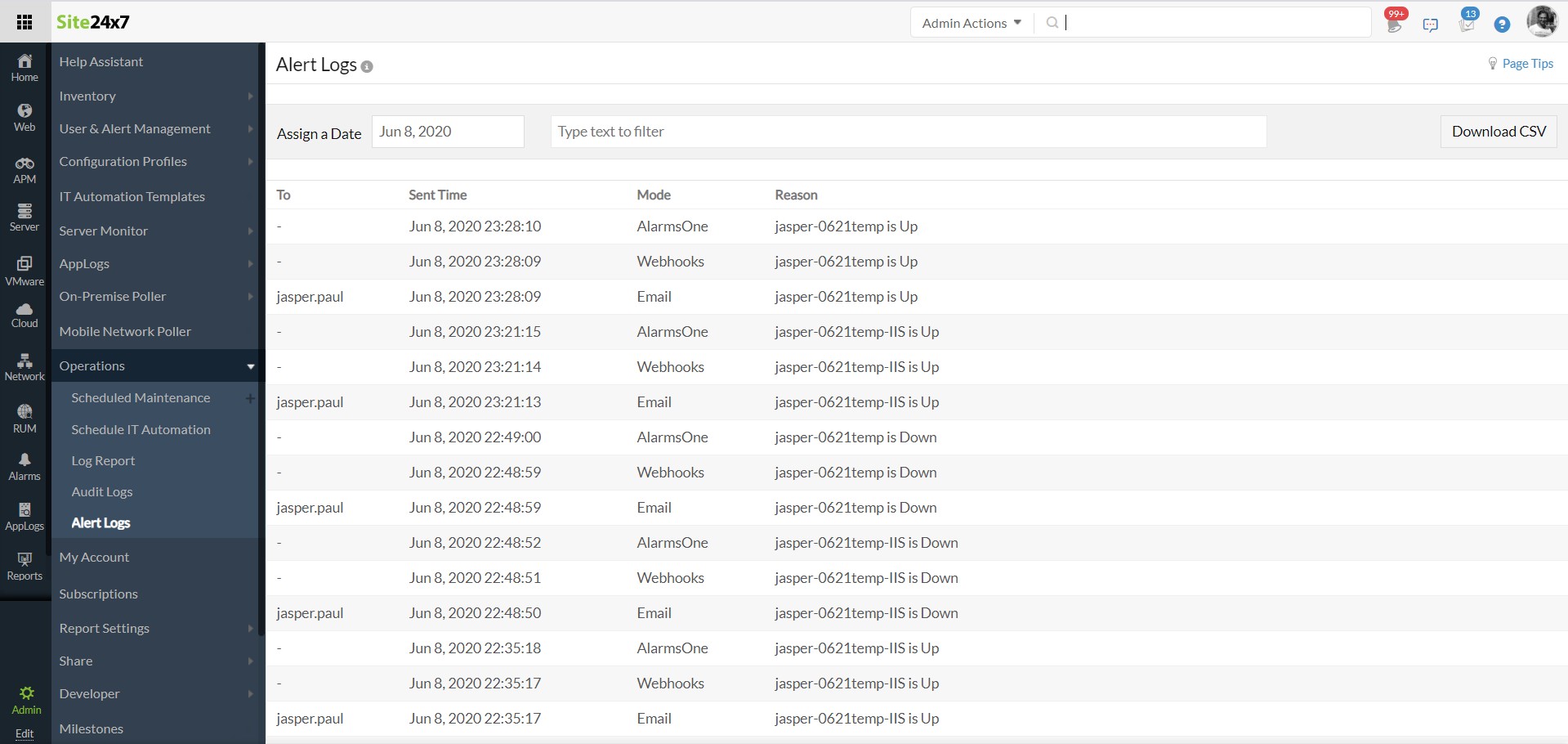 Alternatively, on the problem you faced, here is a quick cross-check that you can do. From The Admin tab, Navigate to Operations > Alert Logs (you can also search from our global search which now supports Admin actions) and check if an email was sent from us. This way you know if we sent the alert mail or not (This doesn't compensate for the lack of Test mail feature though).