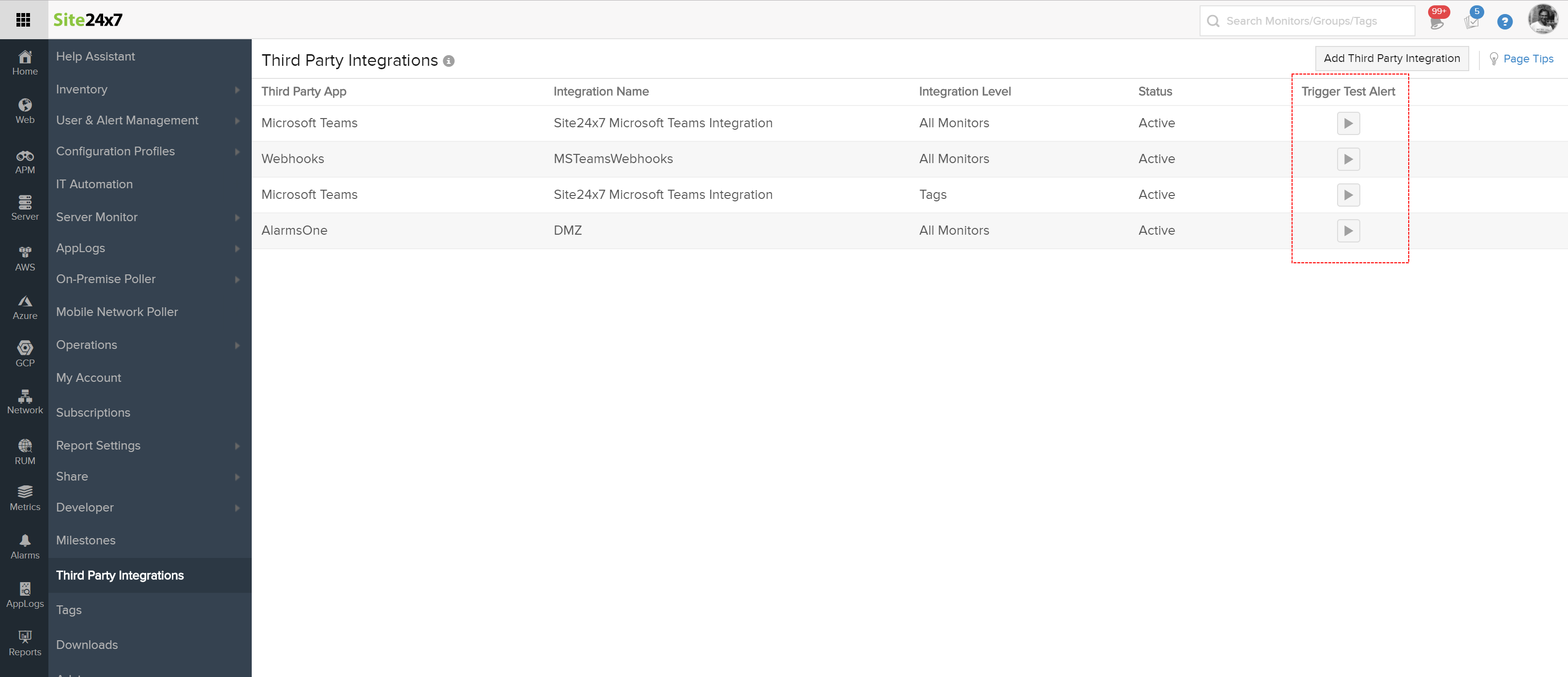 Test alerts for 3rd party integrations are now supported. In Admin tab > Third party integrations page, you can now trigger a test alert.